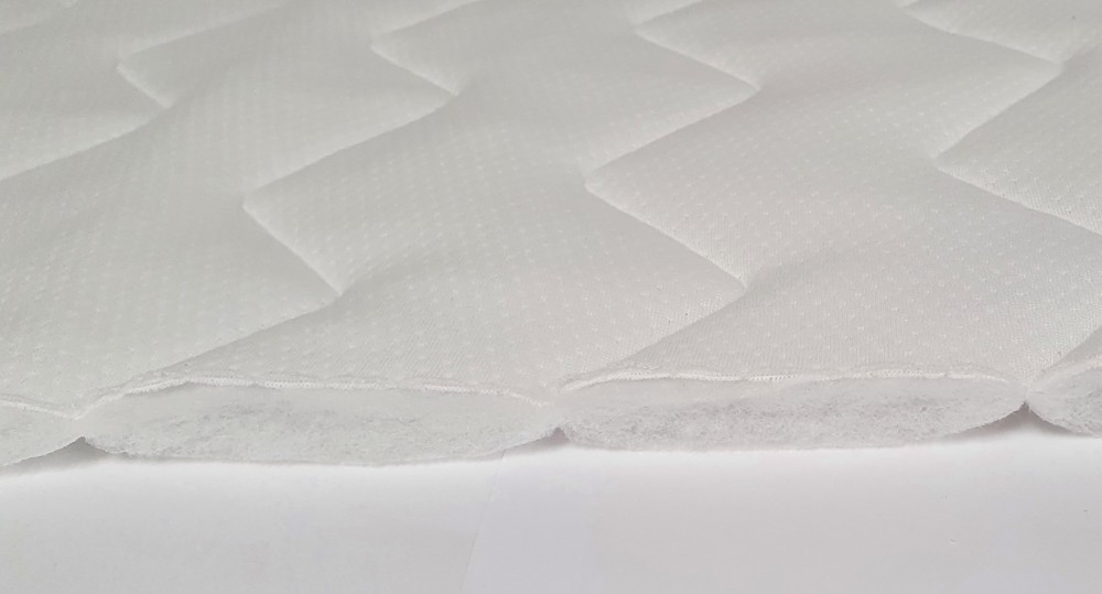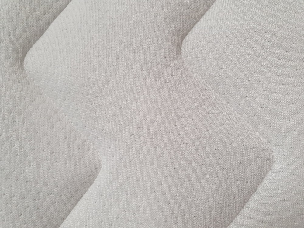 lágy, megemelt vastagságú (200 gr/m²) PES szálbundával steppelt, fehér-tűpettyes kötött kelme, levehető, alacsony hőfokon mosógépben mosható (max. 40 C°), antiallergén, 100% poliészter összetételű puha matrac anyag.